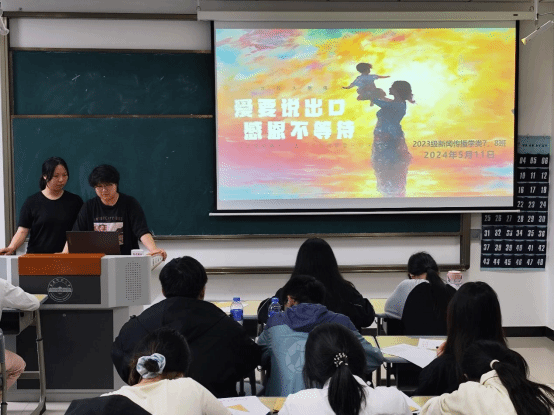 “同學們,猜一猜明天是什么節日啊?”“母親節!”5月11日,新聞傳播學類專業2023(7)、(8)班在K202教室開展以“愛要說出口,感恩不等待”為主題的團建活動?;顒娱_始前,活動負責人、新聞傳播學類專業2023(7)、(8)班的班長楊雨霏、朱研溪提前為每位同學準備好信紙和信封。朱研溪說:“我們希望通過寫信這種傳統而深情的溝通方式,讓同學們勇敢表達自己的心聲,將對母親的愛訴說于筆尖。”學生們觀看一段關于母愛的感人短片后,...